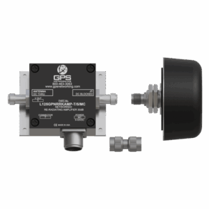 The L1/L2/L5 GNSS Portable Networked Re-Radiating Kit (L125GPNRRKIT) is a repeating kit that is designed for deployments where a full L-band antenna is already in place. The L-band signal received by the previously installed roof antenna is amplified and repeated to GPS receivers inside of a denied space using the passive repeating antenna. The L125GPNRRKIT consists of a passive repeating antenna, a coaxial RF adapter, and a repeating amplifier with an external power supply that powers the entire system. A cable from the roof antenna to the re-radiating kit is required and can be purchased separately.